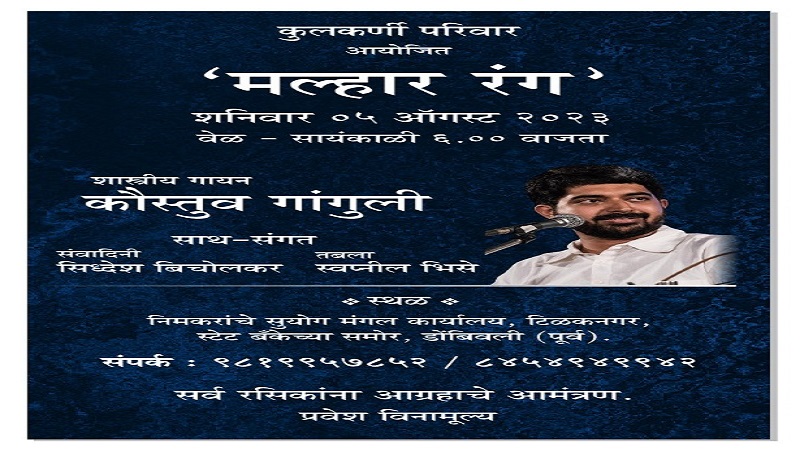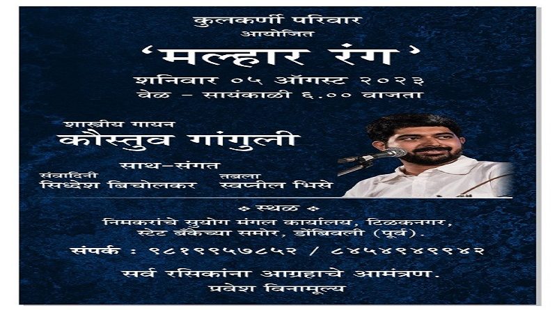 कुलकर्णी परिवार की ओर से 5 अगस्त को ‘मल्हार रंग’ कार्यक्रम का आयोजन किया गया है. पं. अजय चक्रवर्ती के शिष्य कौस्तुव गांगुली गायन करेंगे।