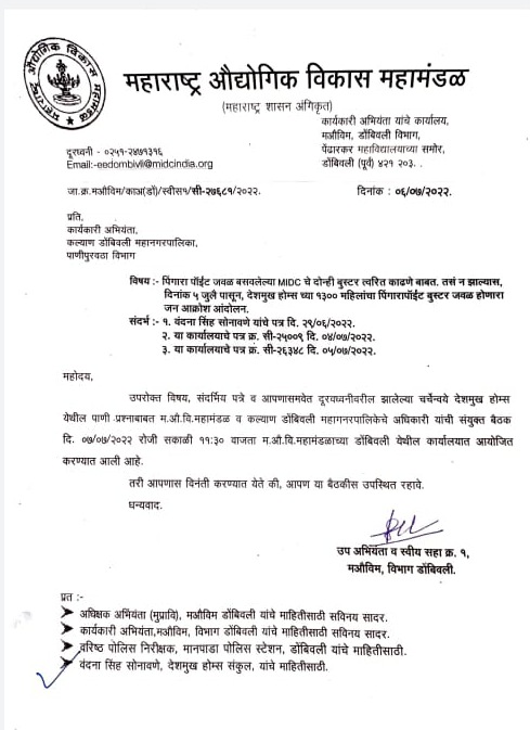 वंदना सिंह सोनवने के अनुसार गुरुवार 7 जुलाई को औद्योगिक महामंडल कार्यालय में 11:30 बजे मीटिंग फिक्स हुई है जिसमें महामंडल के साथ कल्याण मनपा के अधिकारी भी उपस्थित रहेंगे।