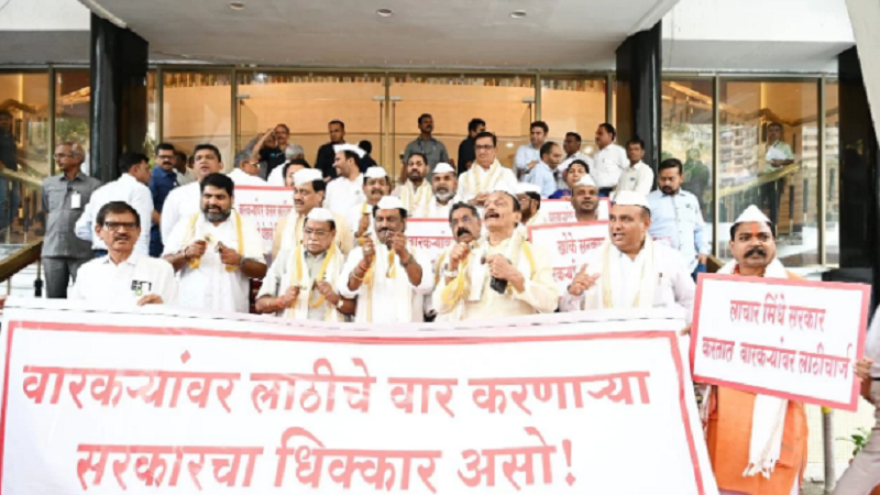 आषाढ़ी वारी के दौरान आलंदी में कार्यकर्ताओं पर हुए लाठीचार्ज मामले में विपक्षी दलों ने सत्र शुरू होने से पहले विधान भवन की सीढ़ियों पर विरोध प्रदर्शन किया। सरकार के खिलाफ जोरदार नारे लगाये गये।