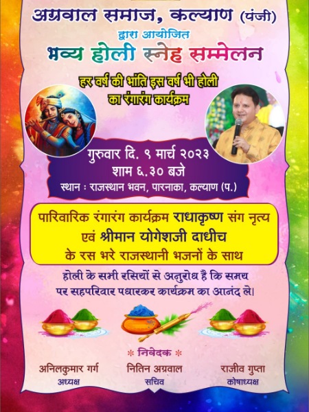 अग्रवाल समाज कल्याण द्वारा महापर्व होली के शुभ अवसर पर भव्य होली मिलन समारोह का आयोजन किया गया है। अग्रवाल…